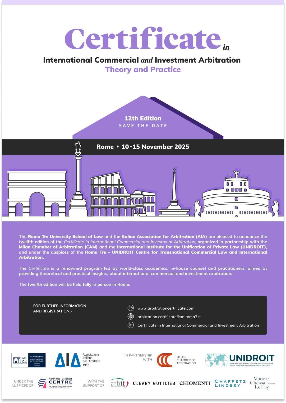 The Department of Law of Roma Tre University and the Italian Association for Arbitration (AIA), in partnership with the Milan Chamber of Arbitration (CAM) and UNIDROIT, are pleased to announce the twelfth edition of the Certificate in International Commercial and Investment Arbitration, which will take place from 10 to 15 November 2025.