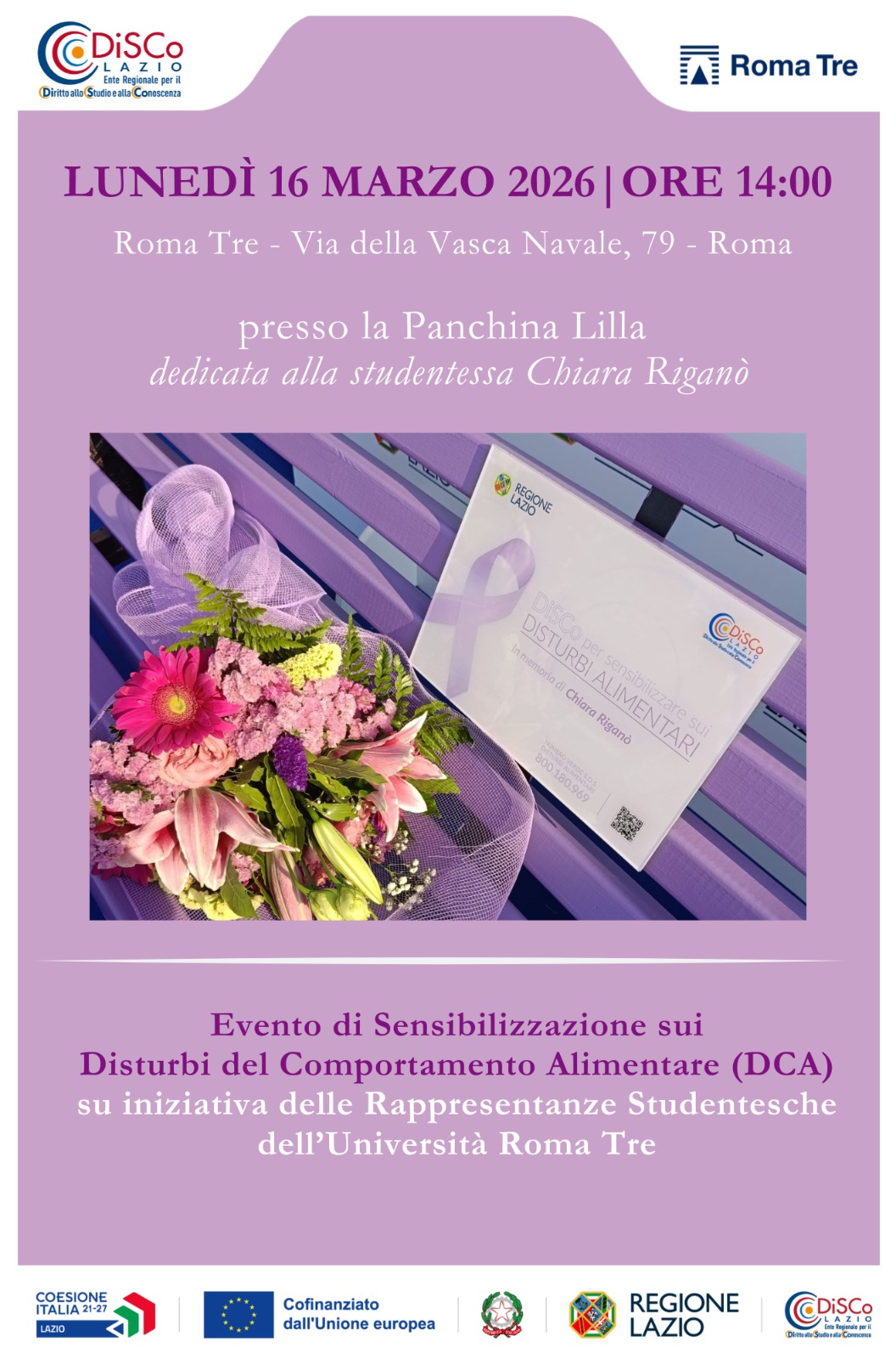 L’iniziativa avrà luogo in Via della Vasca Navale 79, presso la Panchina Lilla, simbolo della lotta contro i disturbi alimentari e dedicata alla studentessa Chiara Riganò.