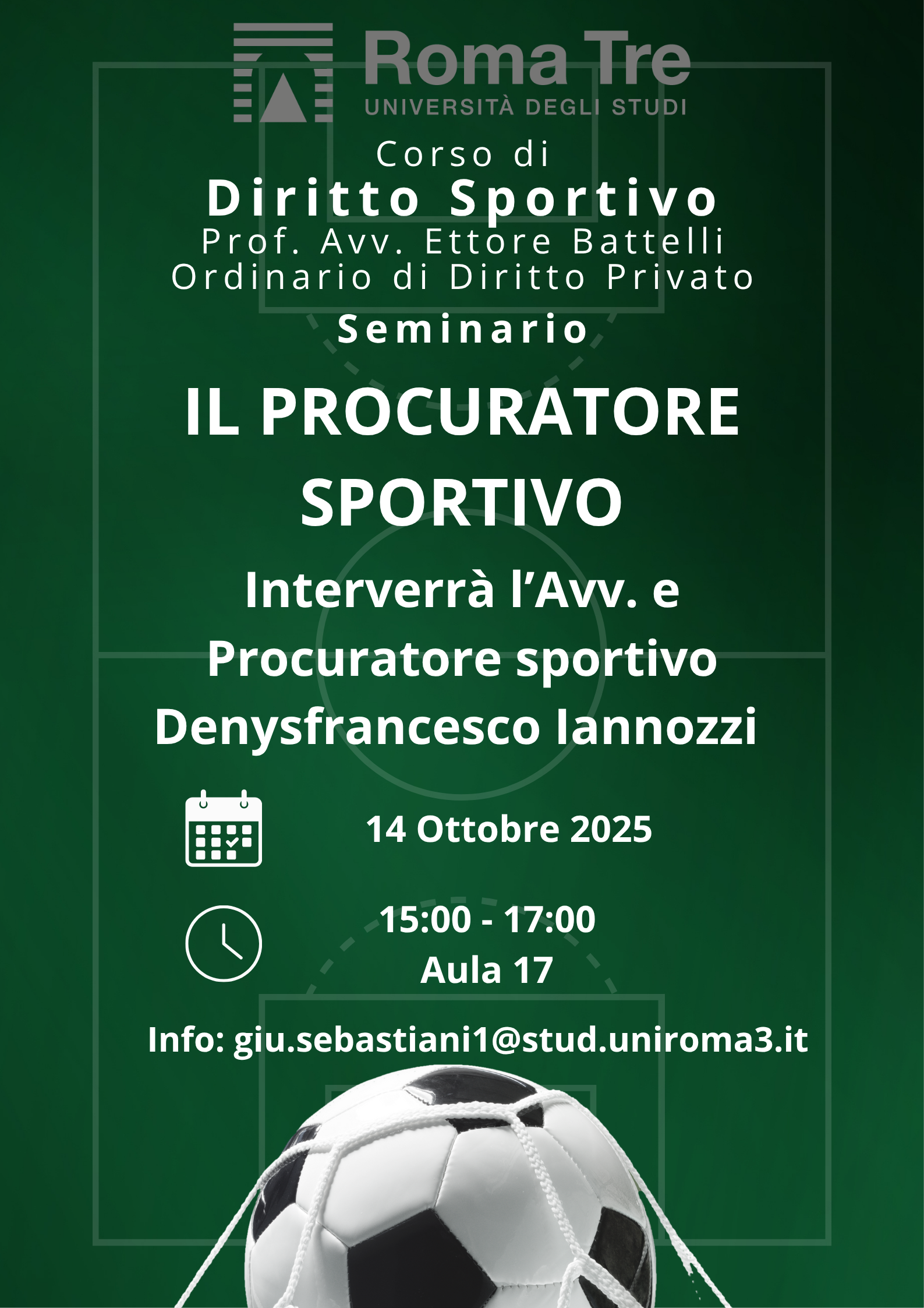 Martedì 14 ottobre 2025 alle ore 15:00, presso il Dipartimento di Economia (Aula 17) si terrà il seminario “Il procuratore sportivo”, in cui interverrà l’Avv. e Procuratore sportivo Denysfrancesco Iannozzi.