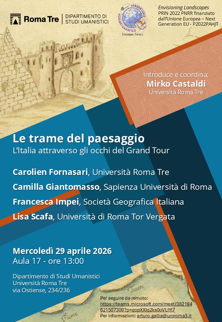 Mercoledì 29 aprile 2026 alle ore 13:00 presso l’Aula 17 del Dipartimento di Studi Umanistici (via Ostiense 234/236), si terrà l’incontro dal titolo “Le trame del paesaggio. L’Italia attraverso gli occhi del Grand Tour”, organizzato dal Dipartimento e dal Laboratorio Geocartografico “Giuseppe Caraci”.