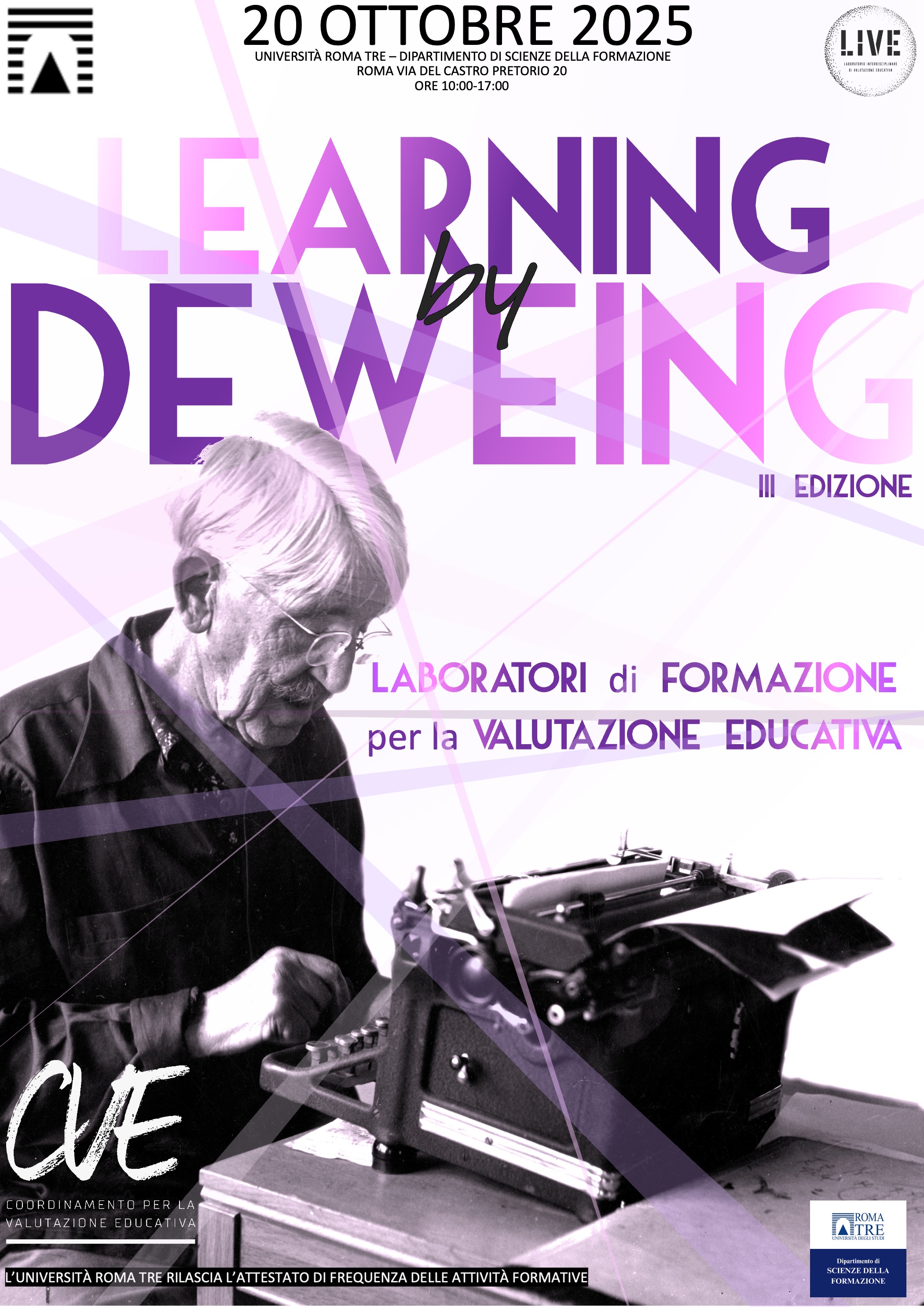 Lunedì 20 ottobre 2025, dalle ore 10.00 alle ore 17.00, presso il Dipartimento di Scienze della Formazione (Via del Castro Pretorio, 20), si terrà l'evento "Learning by Deweing", iniziativa di formazione laboratoriale per la valutazione educativa, organizzata assieme al CVE (Coordinamento per la Valutazione Educativa).