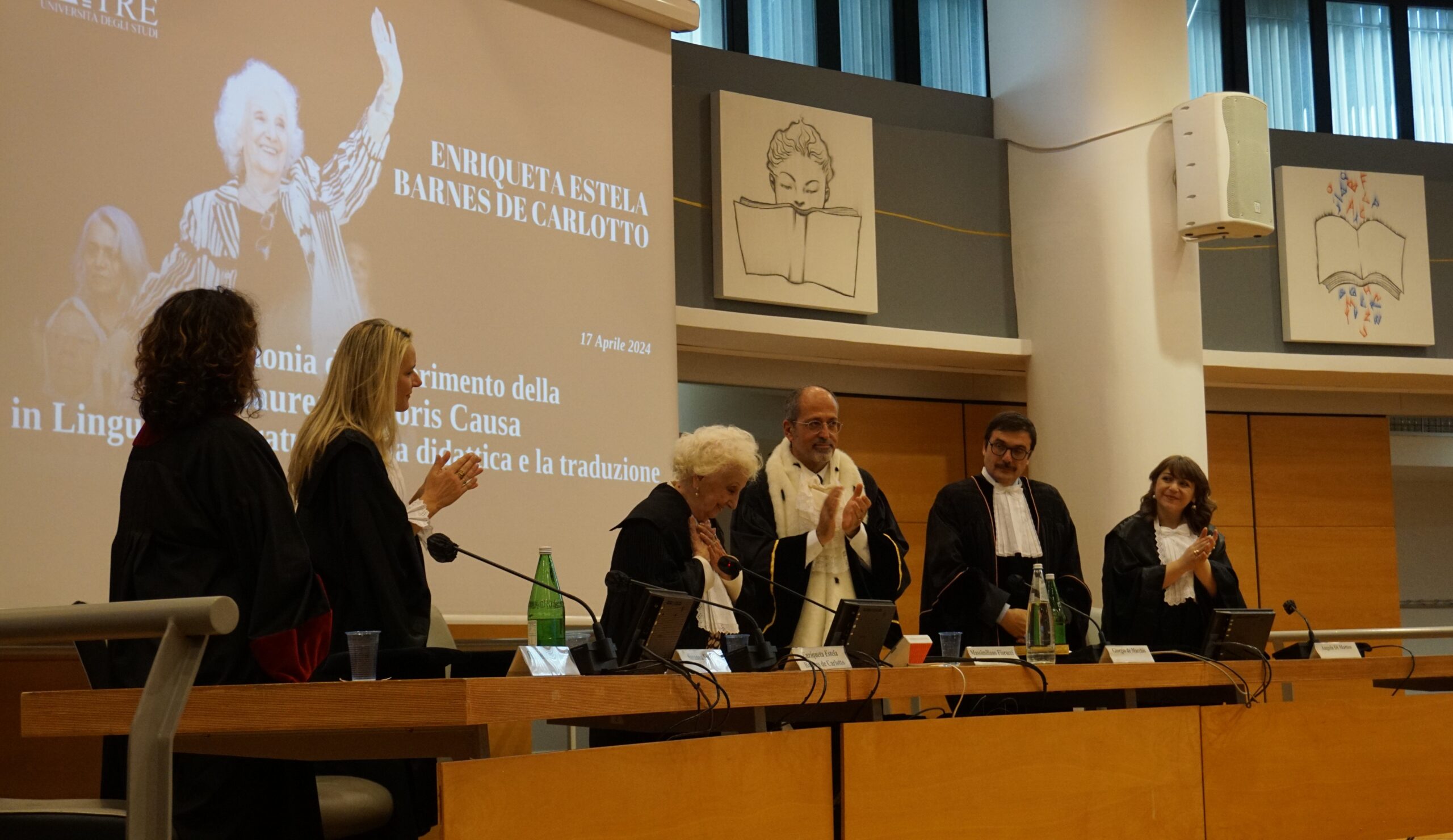 Mercoledì 17 aprile 2024 alle ore 11.30, presso l’Aula Magna di Lettere (via Ostiense 234/236), si è tenuta la cerimonia di conferimento della Laurea Honoris Causa in Lingue e letterature per la didattica e la traduzione a Enriqueta Estela Barnes de Carlotto.
