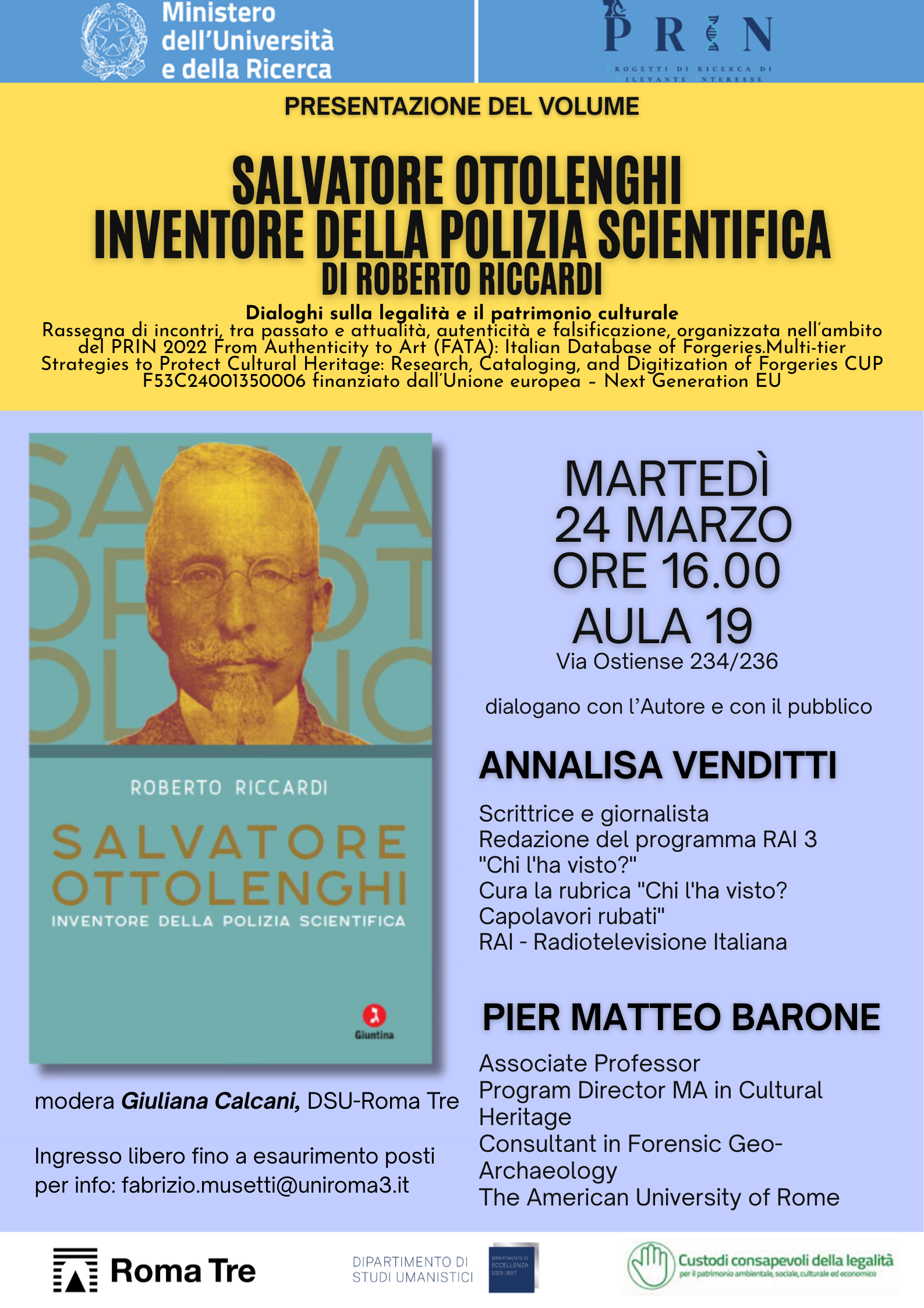Martedì 24 marzo, alle ore 16.00, presso l’Aula 19 (Via Ostiense 234/236), si terrà il terzo incontro della rassegna Dialoghi sul patrimonio culturale e la legalità, dedicato alla presentazione del volume Salvatore Ottolenghi. Inventore della polizia scientifica di Roberto Riccardi, Generale dell’Arma dei Carabinieri.